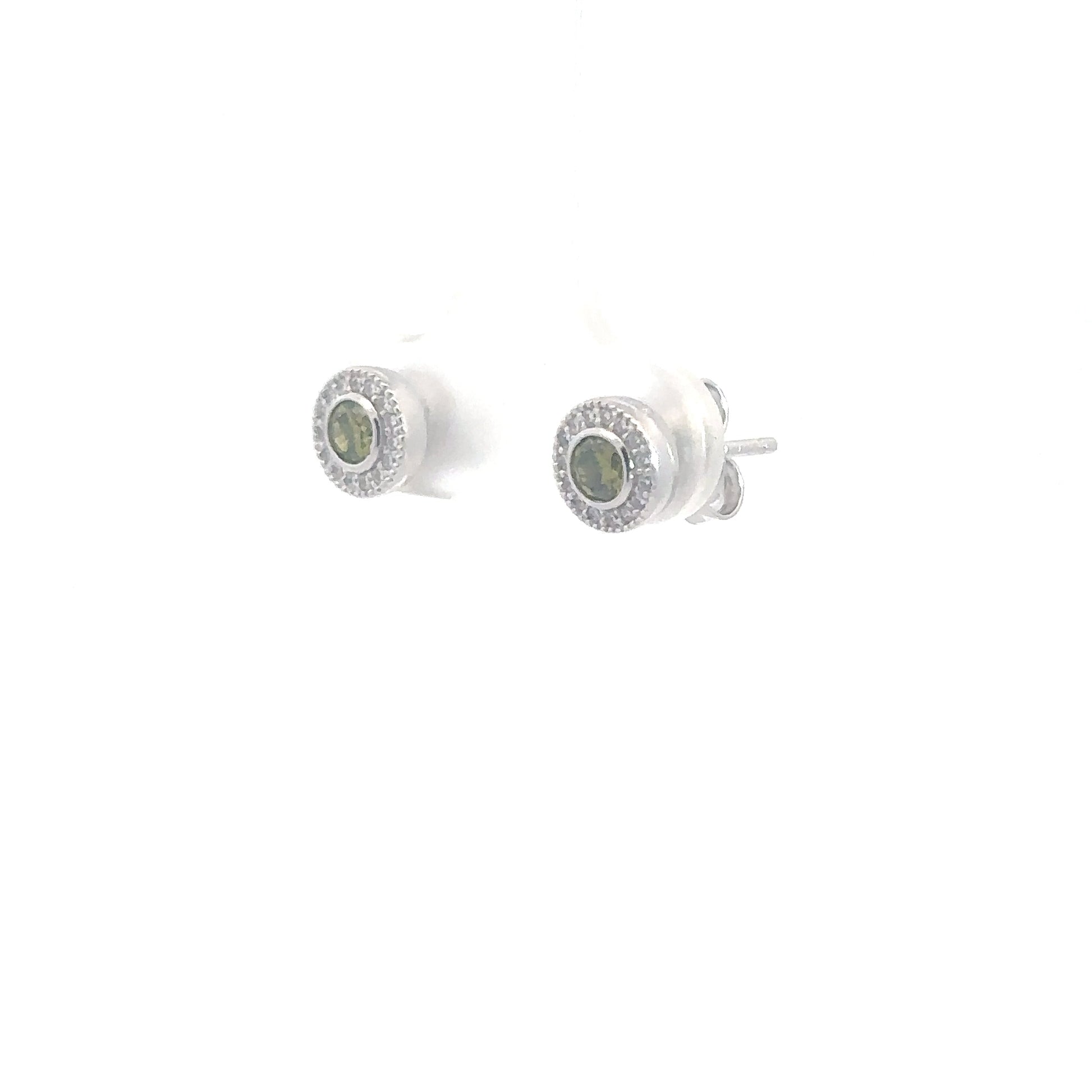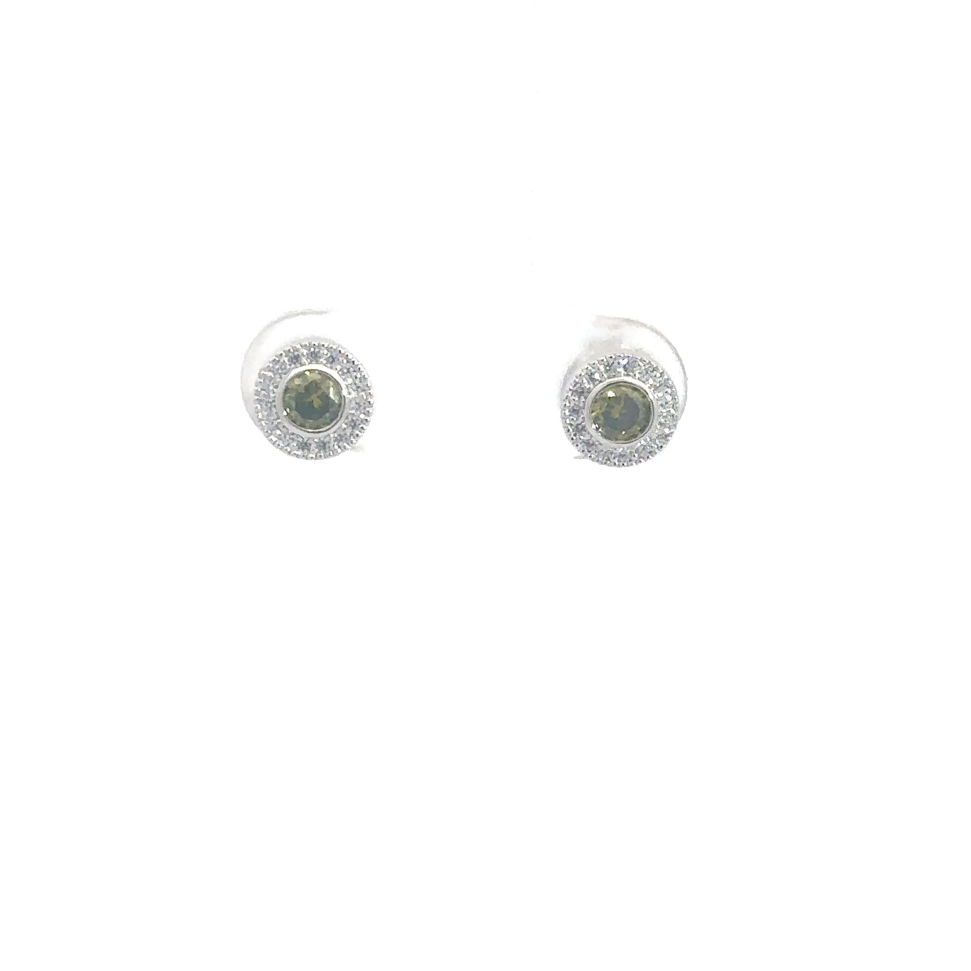 These sterling silver earrings for women feature a vibrant peridot center, beautifully encircled by sparkling micro pave simulated diamonds, creating an elegant and eye-catching accessory.