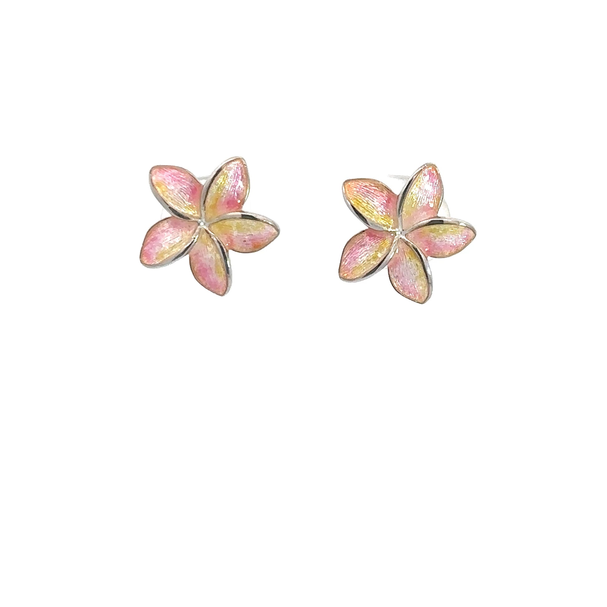 These elegant sterling silver earrings feature delicately hand-enameled pink plumeria flowers, adding a touch of feminine charm to any outfit. Perfect for those who appreciate handcrafted beauty and refined style.
