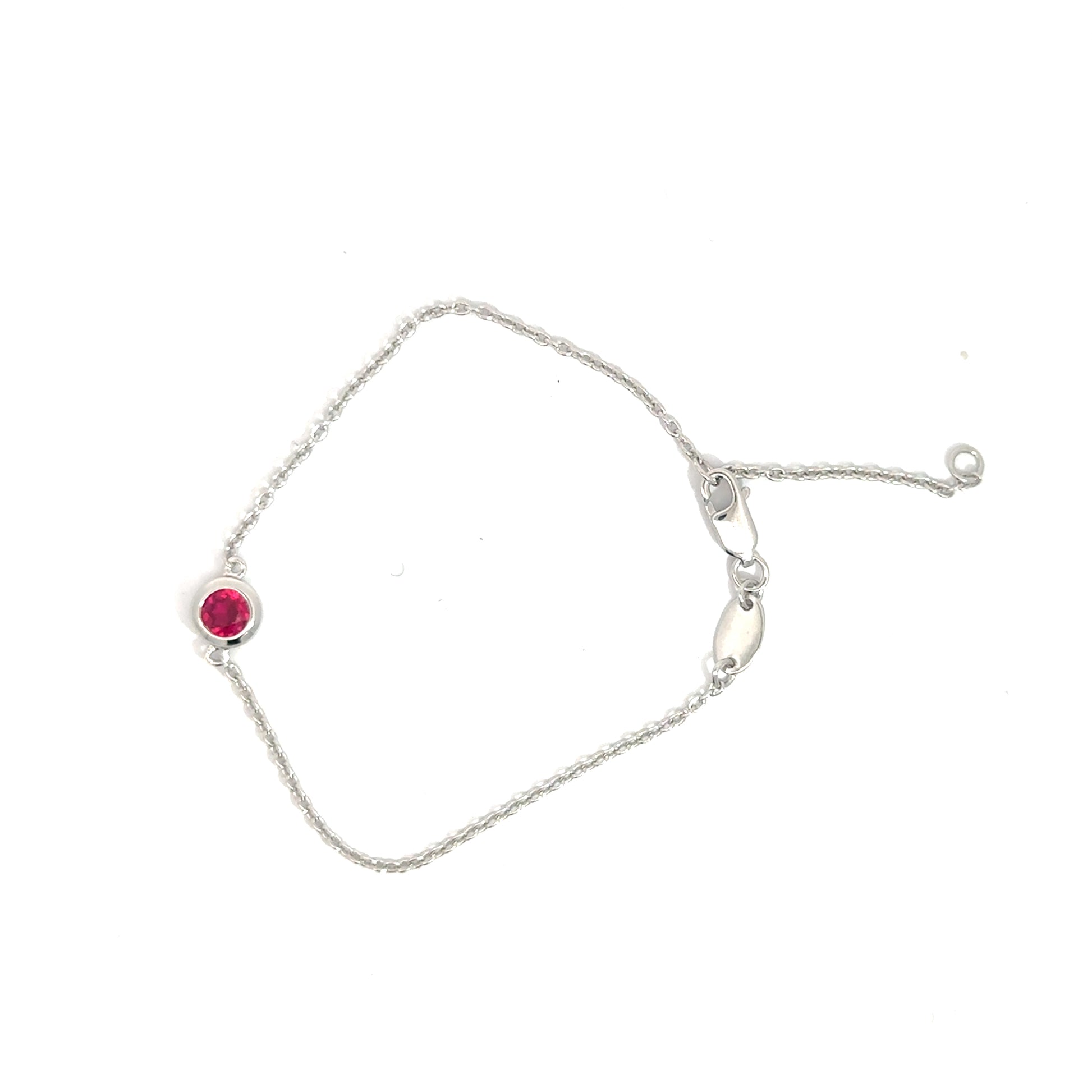 A touch of elegance and sophistication adorns your wrist with this beautiful sterling silver bracelet featuring a bezel set single synthetic ruby stone. A must-have addition to your jewelry collection.