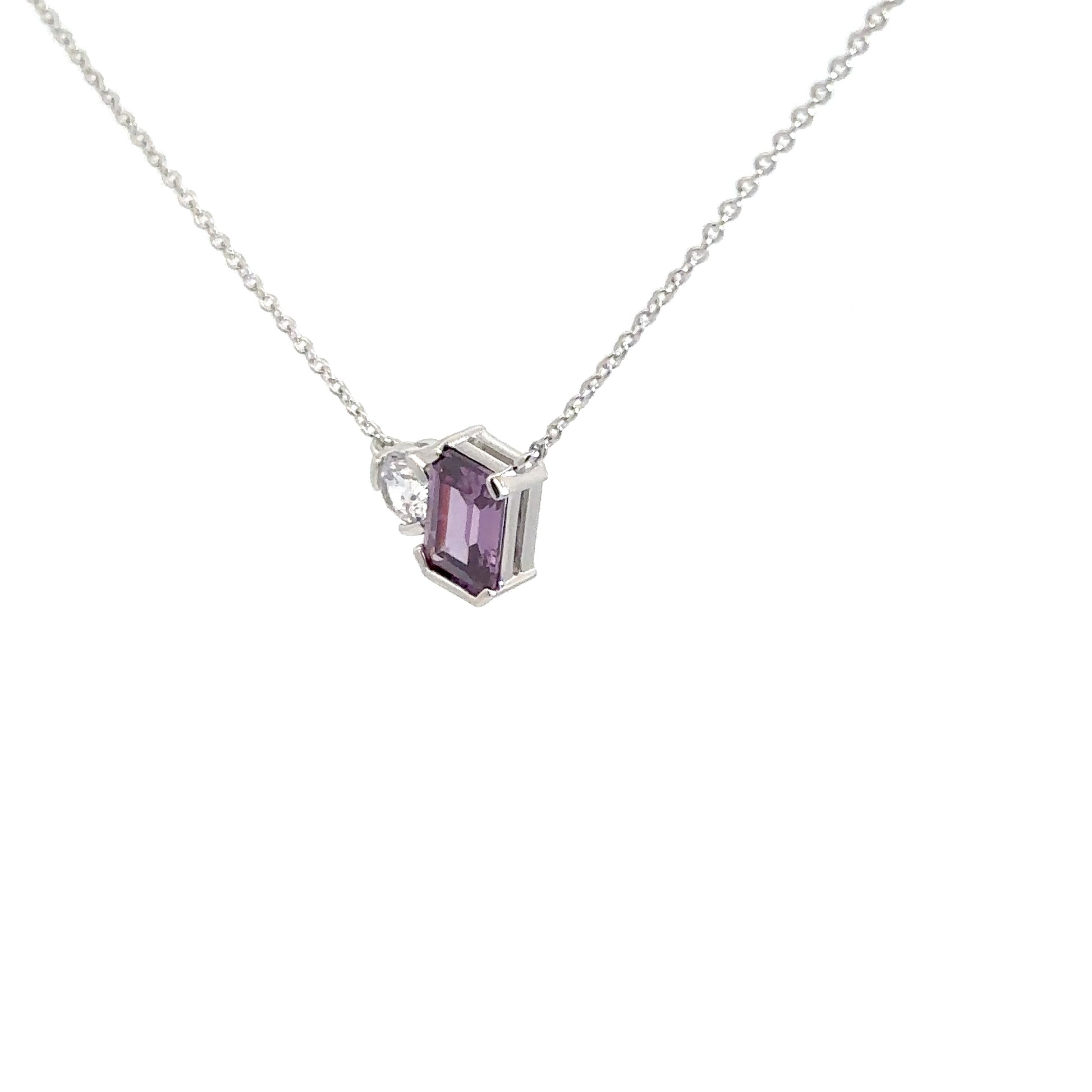 This elegant lady’s pendant features a sterling silver setting with an emerald-cut simulated amethyst and a stationary simulated round diamond, gracefully displayed on a delicate chain.