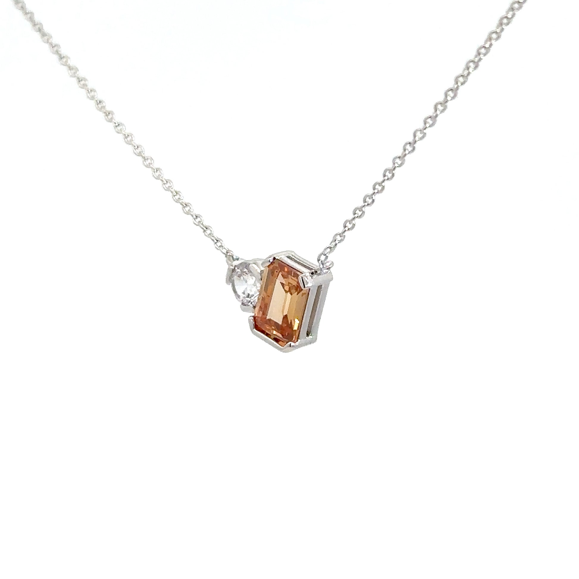 This elegant lady’s pendant features a sterling silver setting with an emerald-cut simulated citrine and a stationary simulated round diamond, gracefully displayed on a delicate chain.