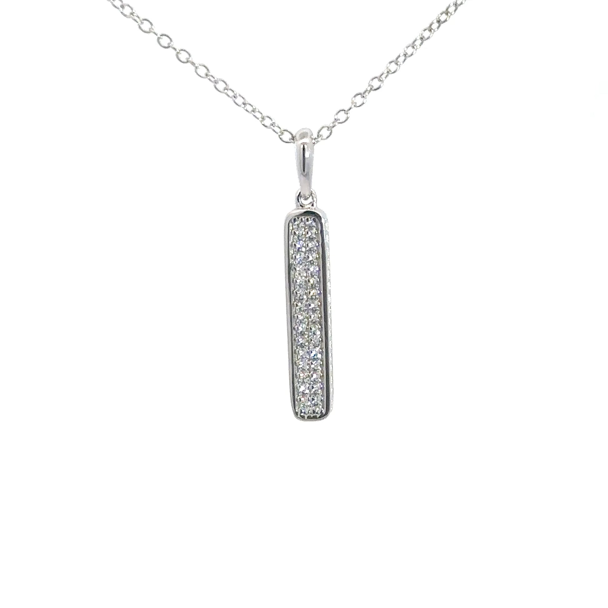 This sterling silver necklace features a vertical bar adorned with micro pave simulated diamonds, creating a stunning and elegant look.