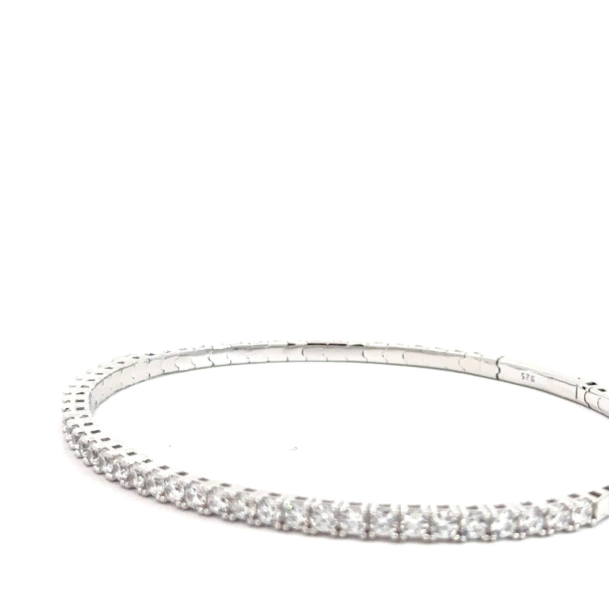 Elegant and versatile, this sterling silver flexi-bangle features stunning simulated diamonds that catch the light beautifully. The flexible design adapts to your wrist for a comfortable, secure fit that moves with you throughout the day. Perfect for layering or wearing solo, this timeless piece combines sophisticated sparkle with everyday wearability.
