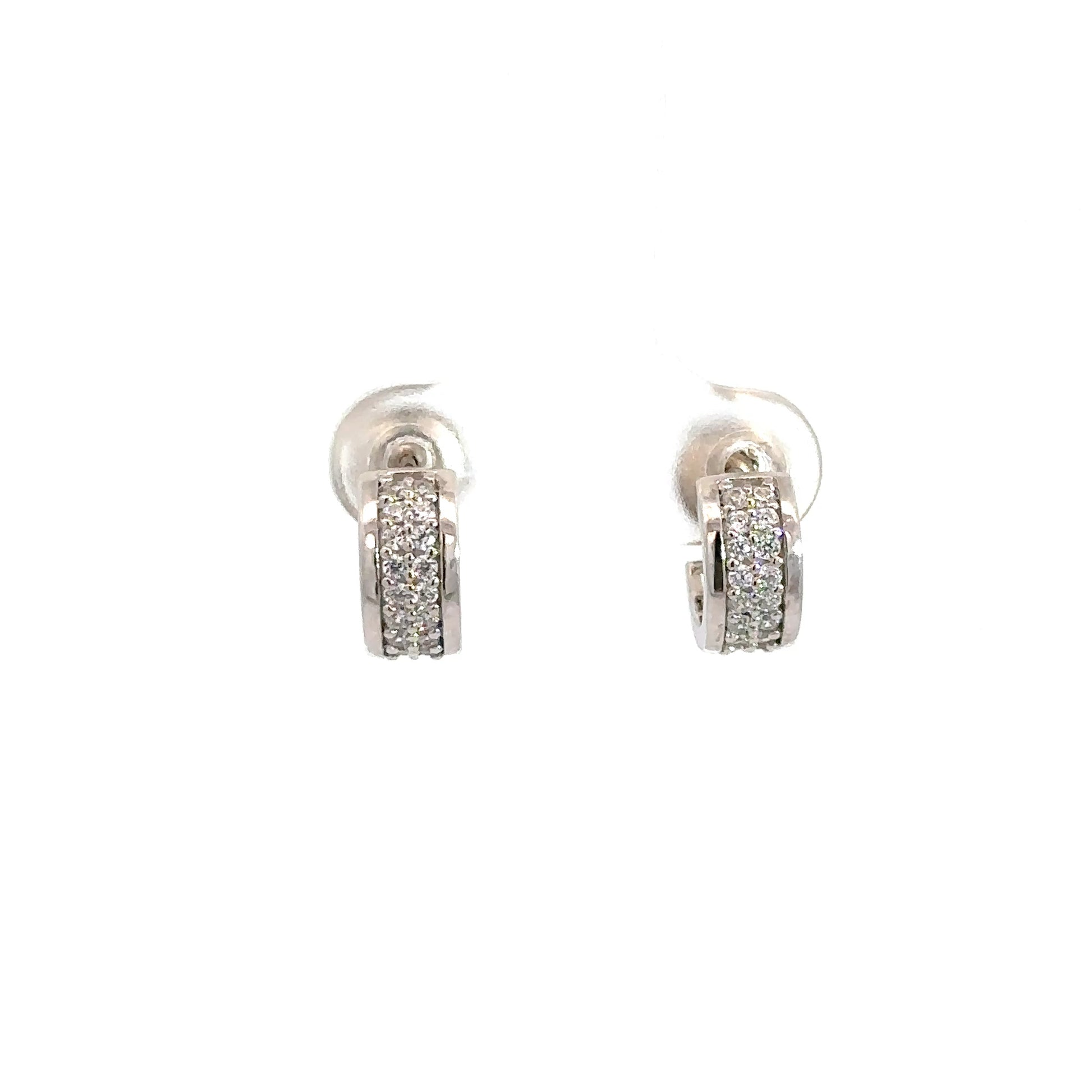 These sterling silver huggie hoop earrings feature dazzling simulated diamonds, designed to add elegance and sparkle to any outfit.