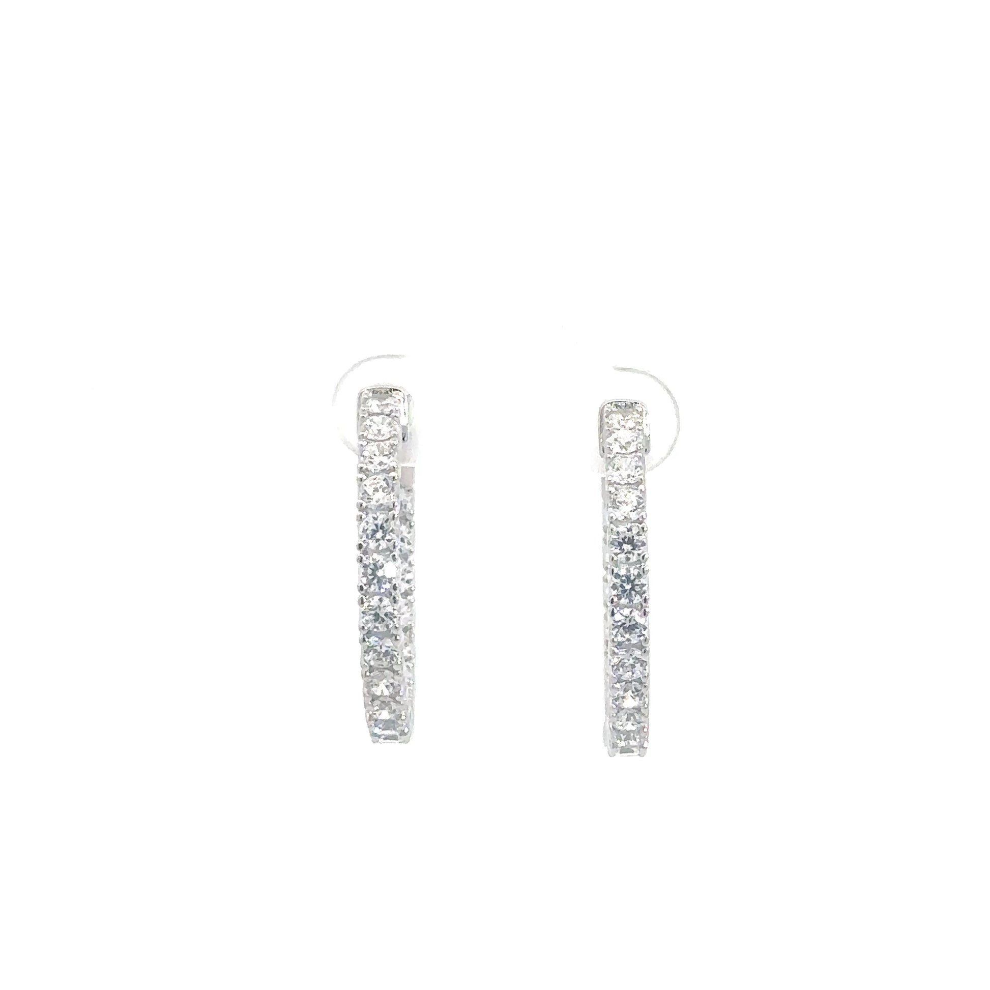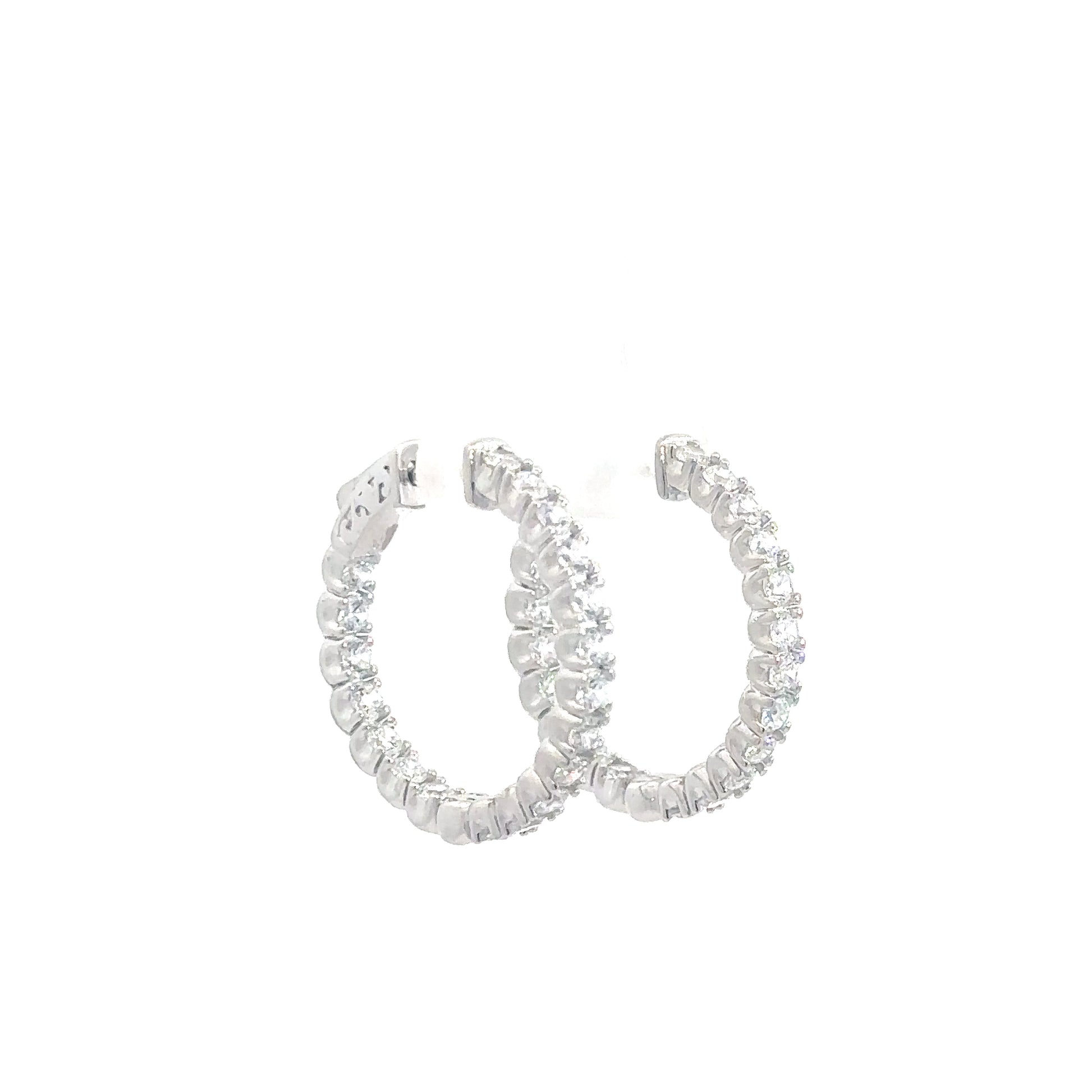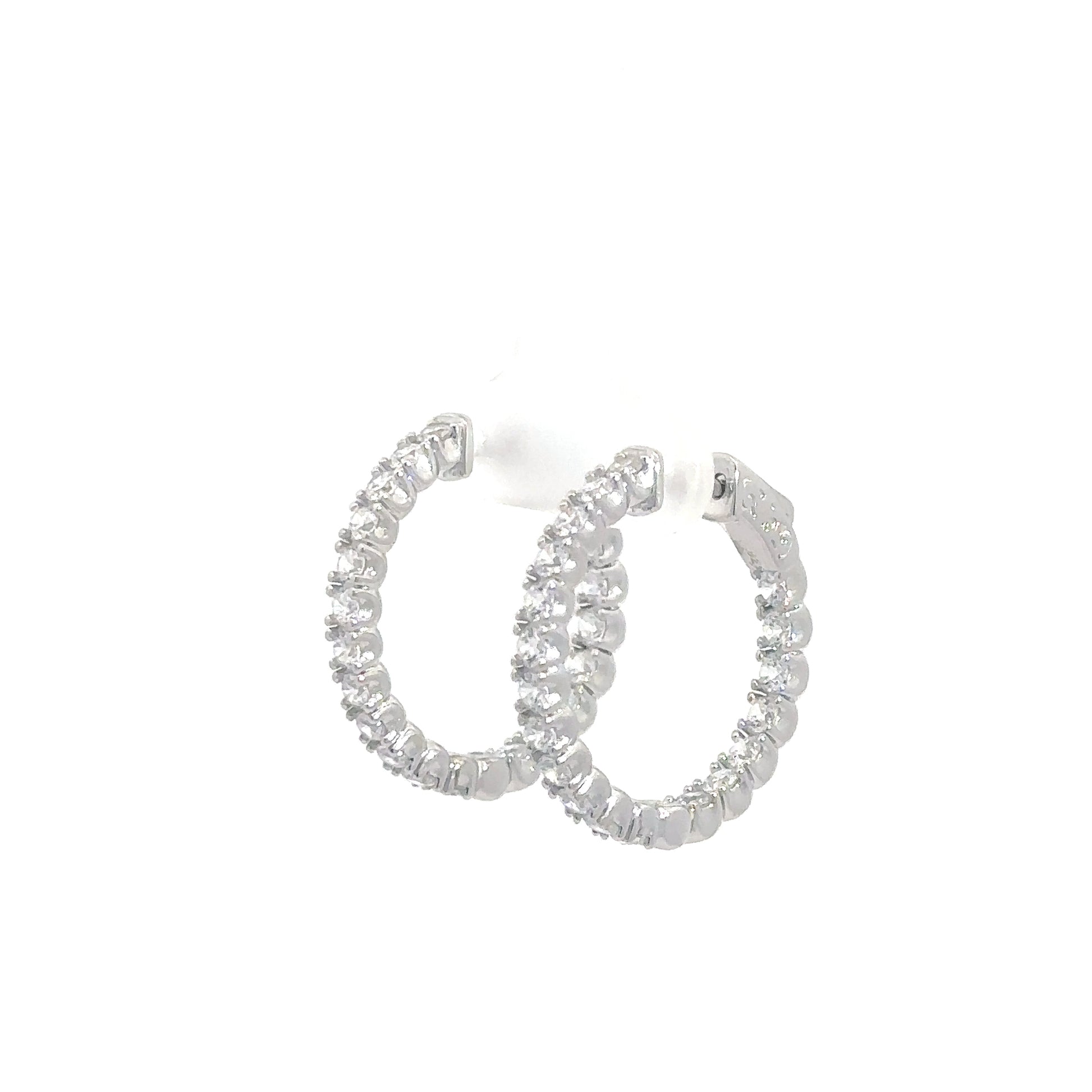 These sterling silver hoops feature simulated diamonds adorning both the inner and outer edges, creating a stunning and elegant look for any occasion.