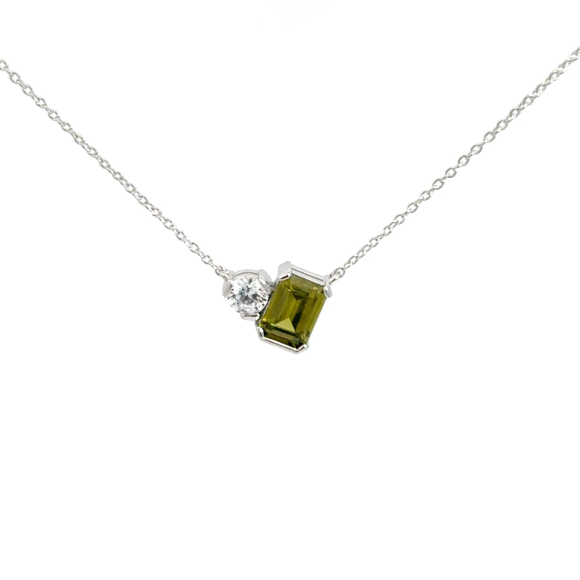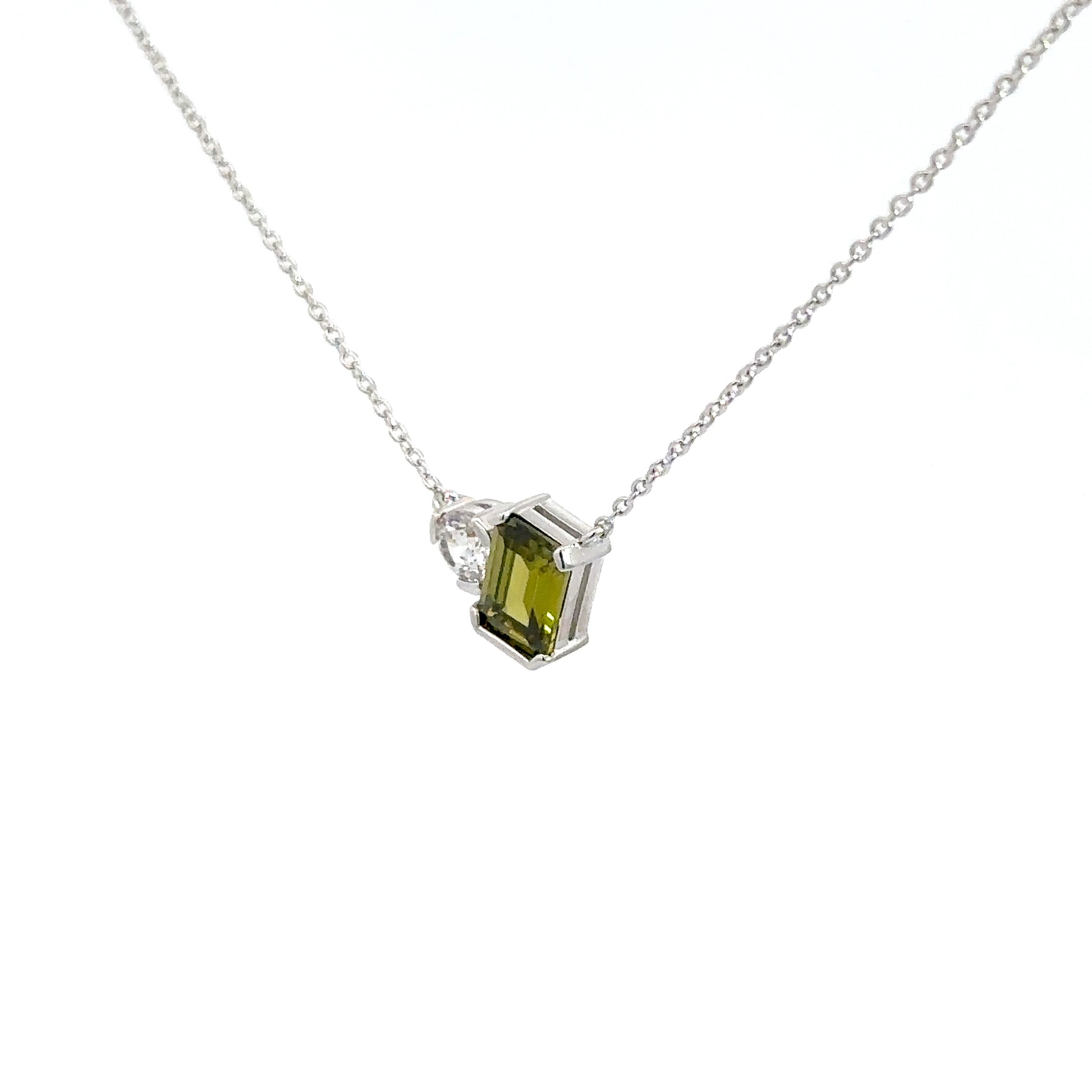 This elegant lady’s pendant features a sterling silver setting with an emerald-cut simulated peridot and a stationary simulated round diamond, gracefully displayed on a delicate chain.