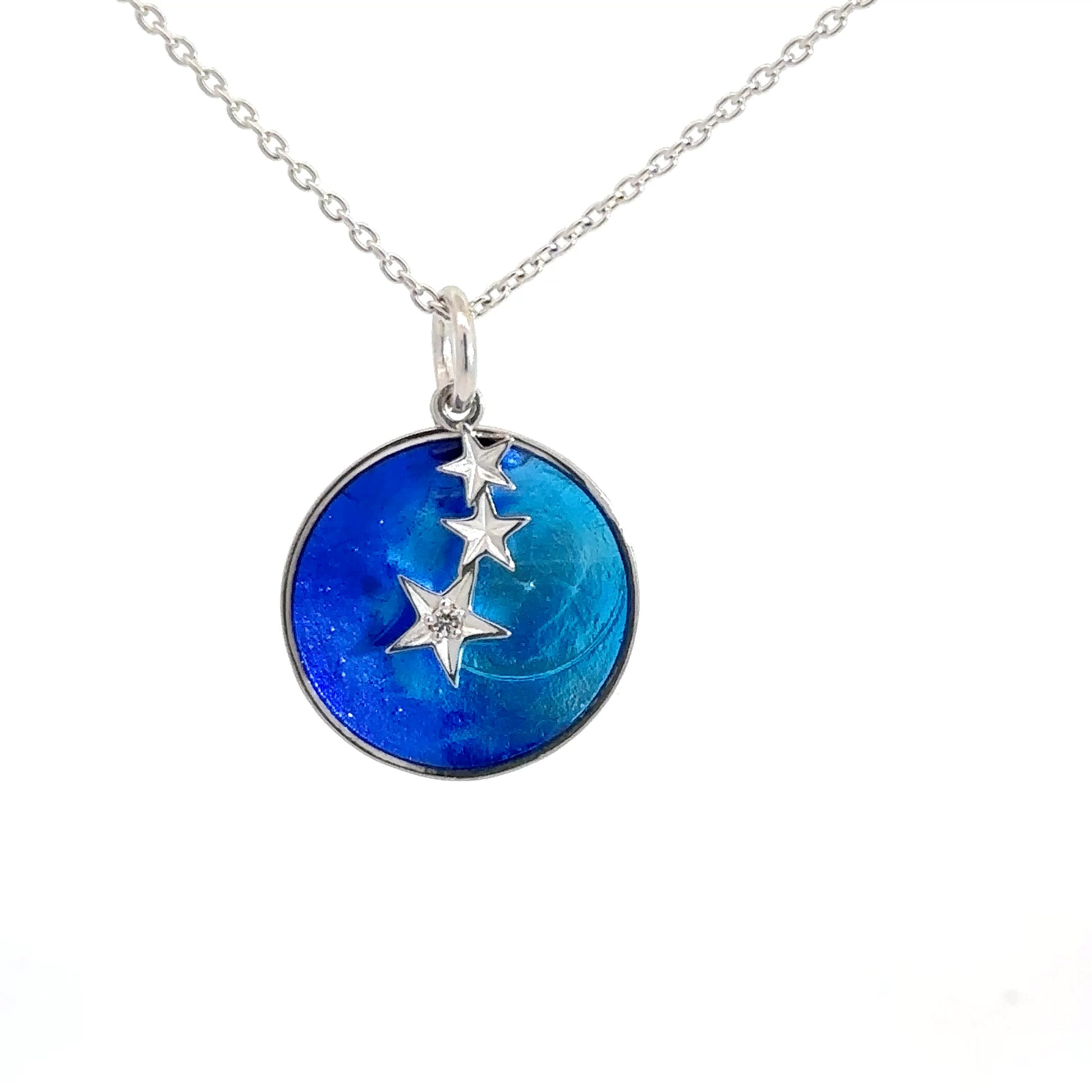The Sterling Silver Starry Night Pendant features three stars and a hand-enameled blue sky design. Crafted from high-quality silver, this pendant exudes a timeless elegance that will elevate any outfit.