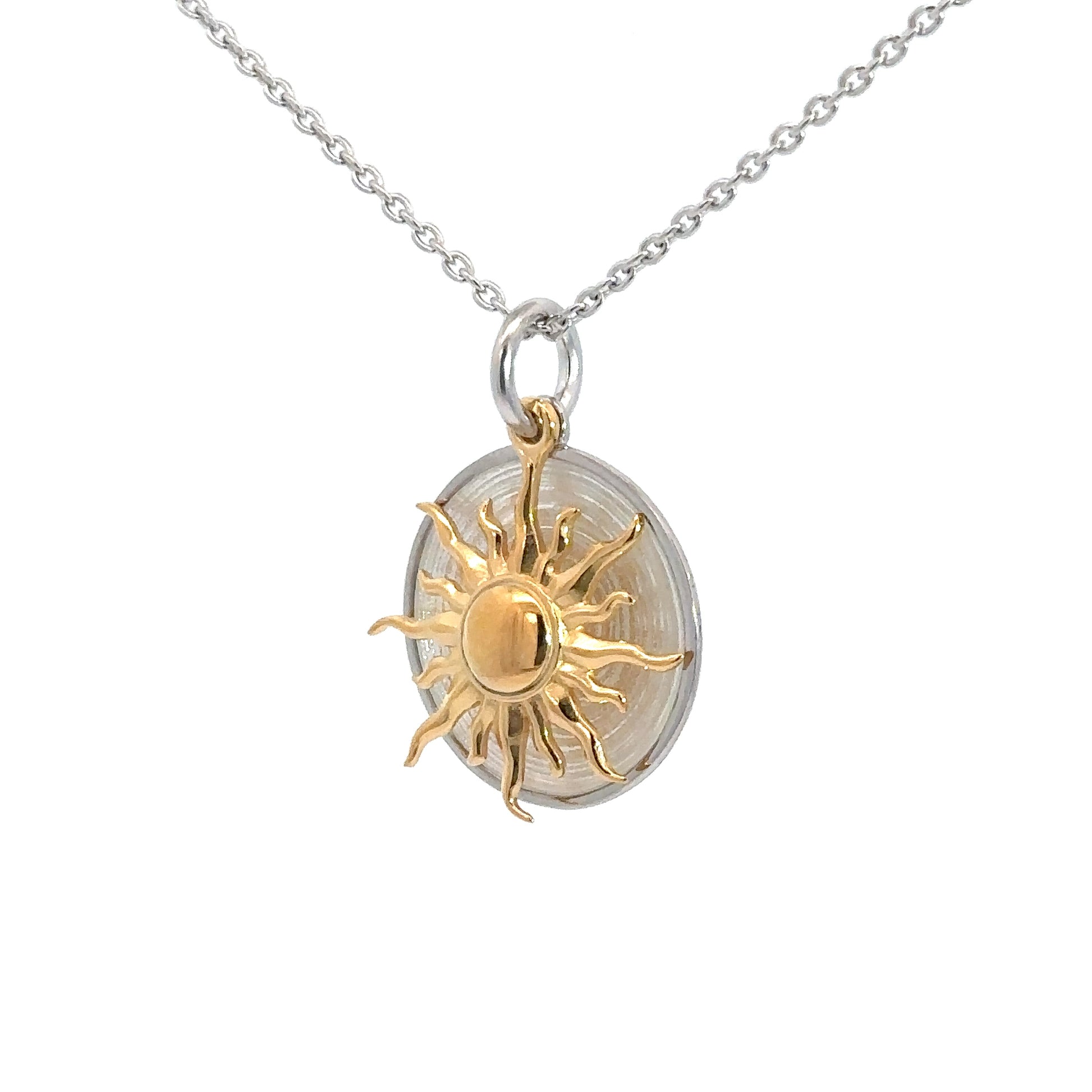 This elegant sun pendant is crafted from sterling silver with a gold plating, featuring a white hand-enameled background for a refined and radiant look.