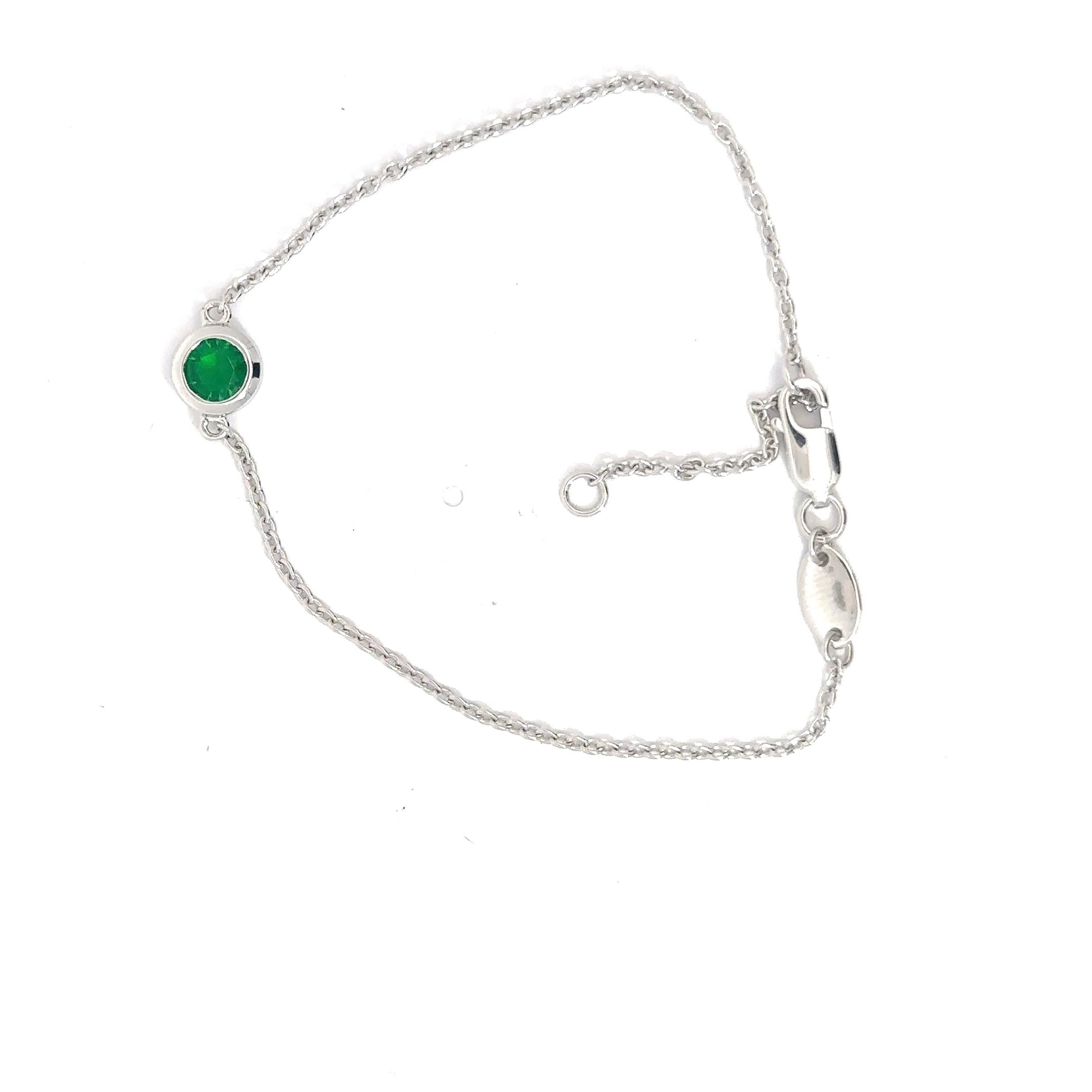 A touch of elegance and sophistication adorns your wrist with this beautiful sterling silver bracelet featuring a bezel set single synthetic emerald stone. A must-have addition to your jewelry collection.