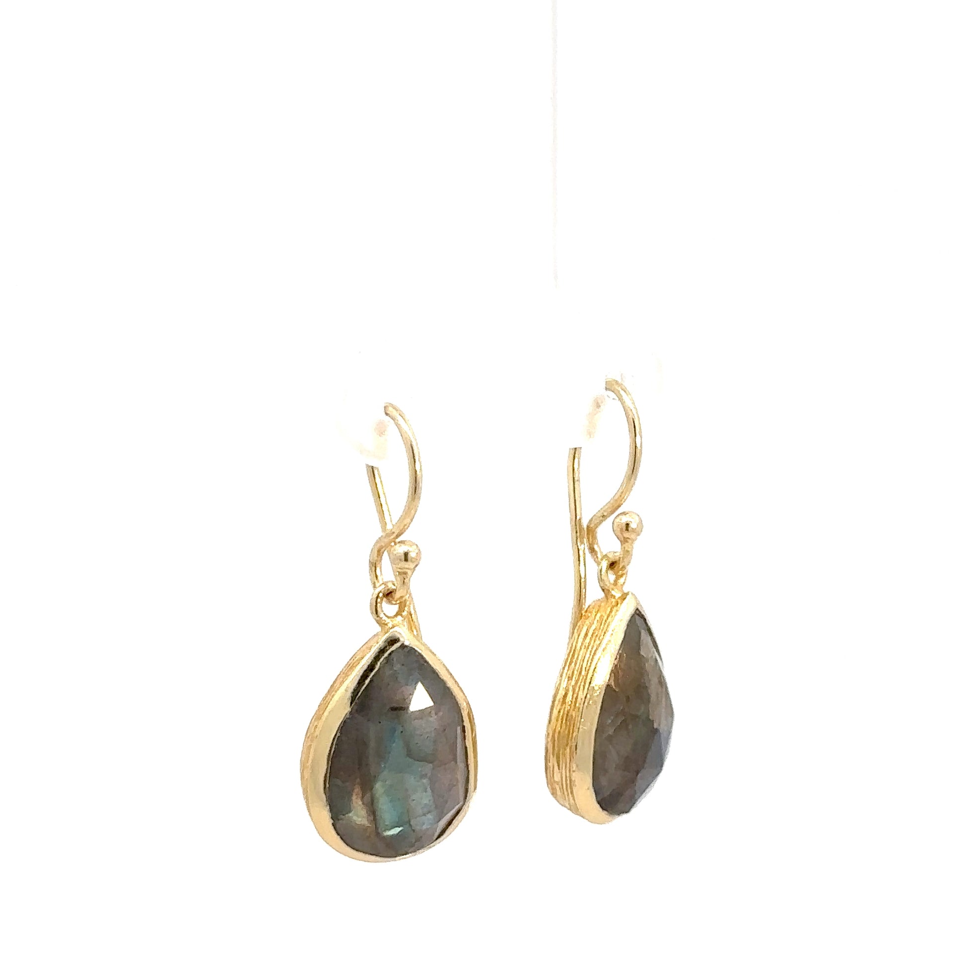 Add some elegance to your outfit with these stunning yellow gold plated labradorite earrings. The pear shaped stones reflect light beautifully and are sure to catch the eye of anyone who sees them. Elevate your accessory game with these unique and stylish earrings!