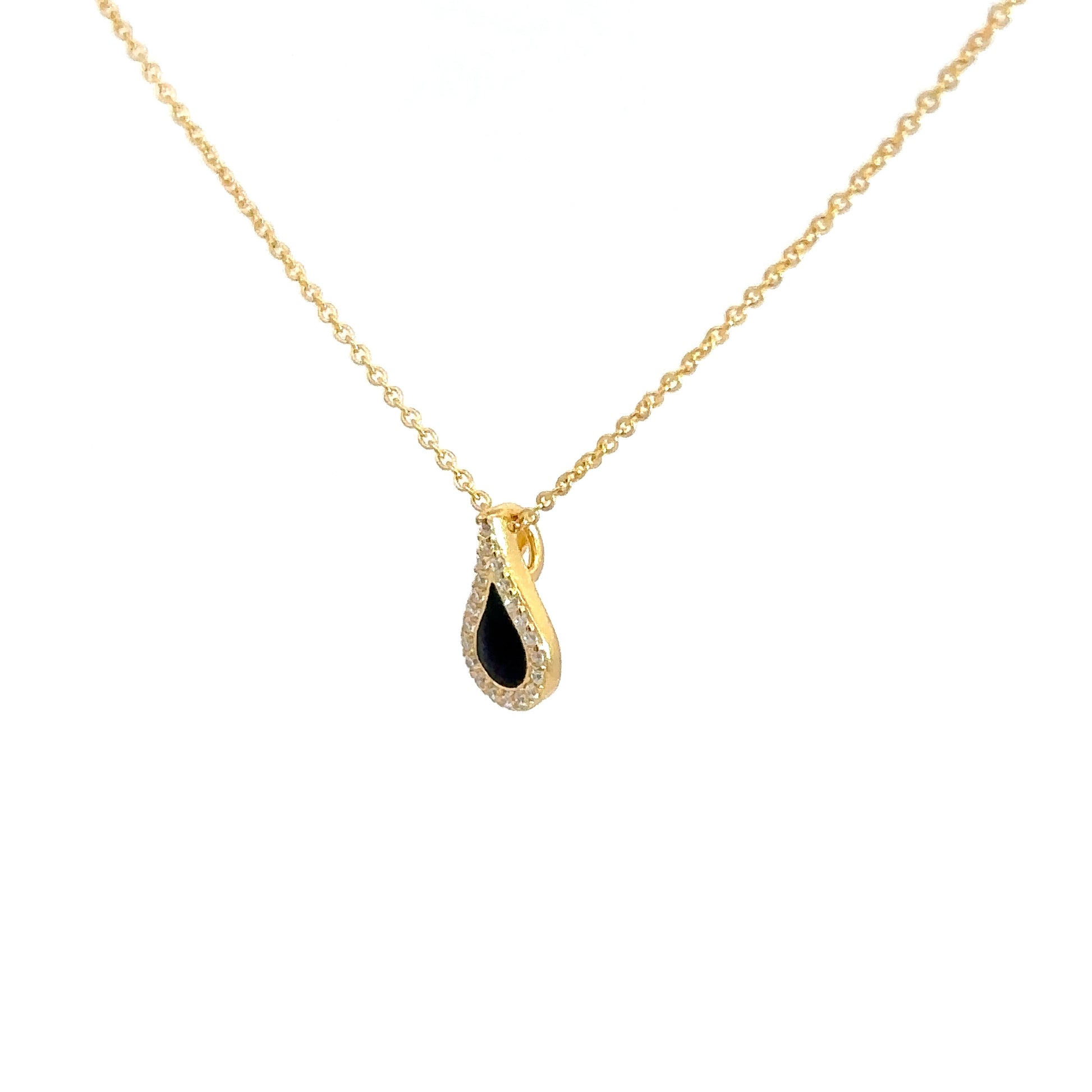 Elevate your everyday elegance with this stunning yellow gold plated pendant, featuring a sophisticated black enamel teardrop accented by a sparkling simulated diamond halo. A timeless piece that combines classic design with modern appeal, this pendant adds a touch of refined glamour to any outfit without the luxury price tag. Perfect for layering or wearing solo, it's the versatile accessory every jewelry collection deserves.