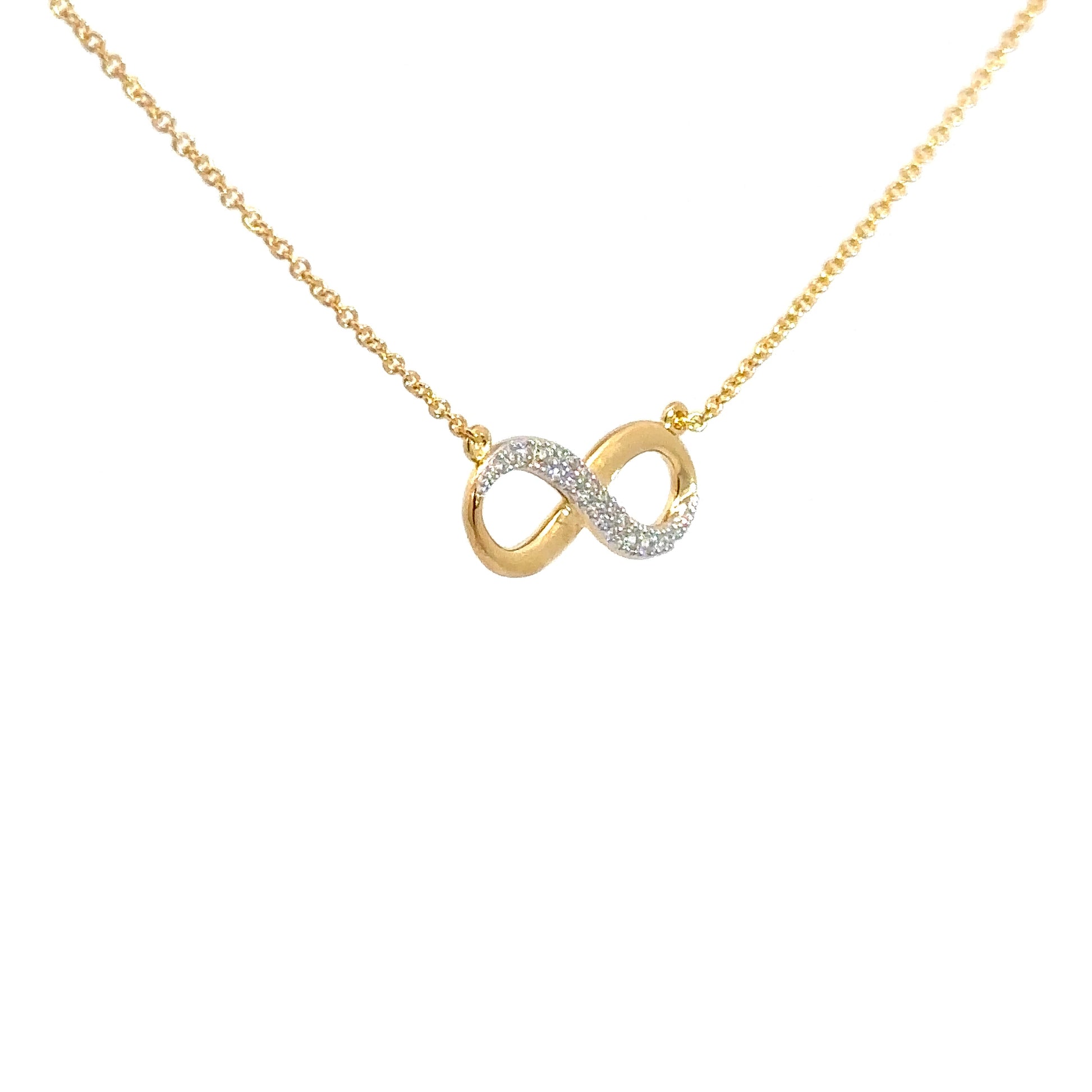 This elegant pendant features a sterling silver base with a yellow gold plating, showcasing sparkling simulated diamonds in an infinity design that symbolizes endless beauty and commitment.